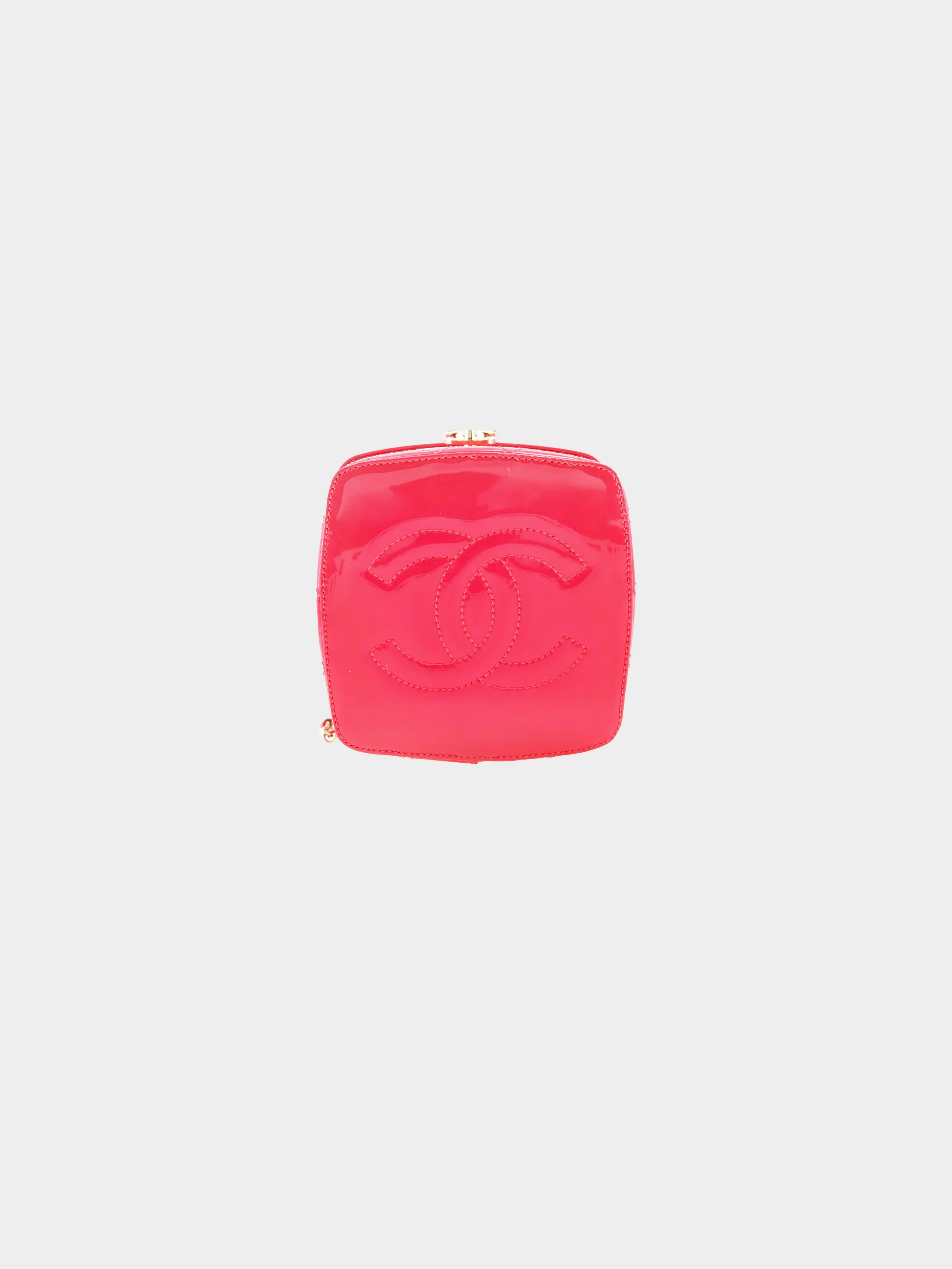 From the 2016 Chanel collection, this bag is crafted from pink patent leather with a matching pink interior. It features the signature quilt stitching throughout. The vanity bag has a matching patent leather threaded gold chain-link shoulder strap, and gold hardware including a Chanel CC turn lock. The inner mirror is discolored, with slight scratches and peeling.
