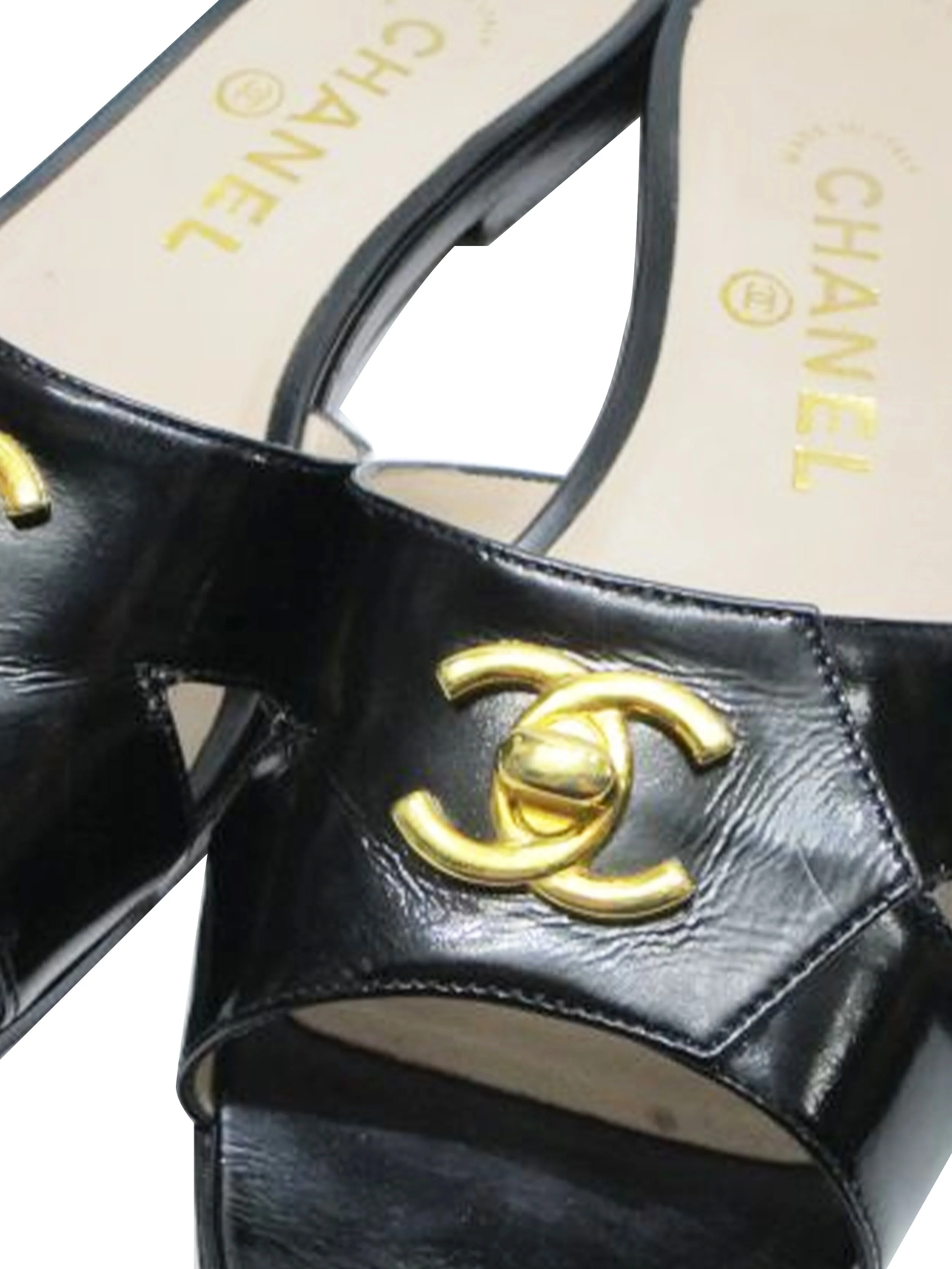 From an early 2000s Chanel collection, these incredible sandals features the signature CC gold logo in the front. Composed of genuine black leather and lined with white leather interior. It has gold hardware throughout. Rare and hard to come by. Comes with with the original box.