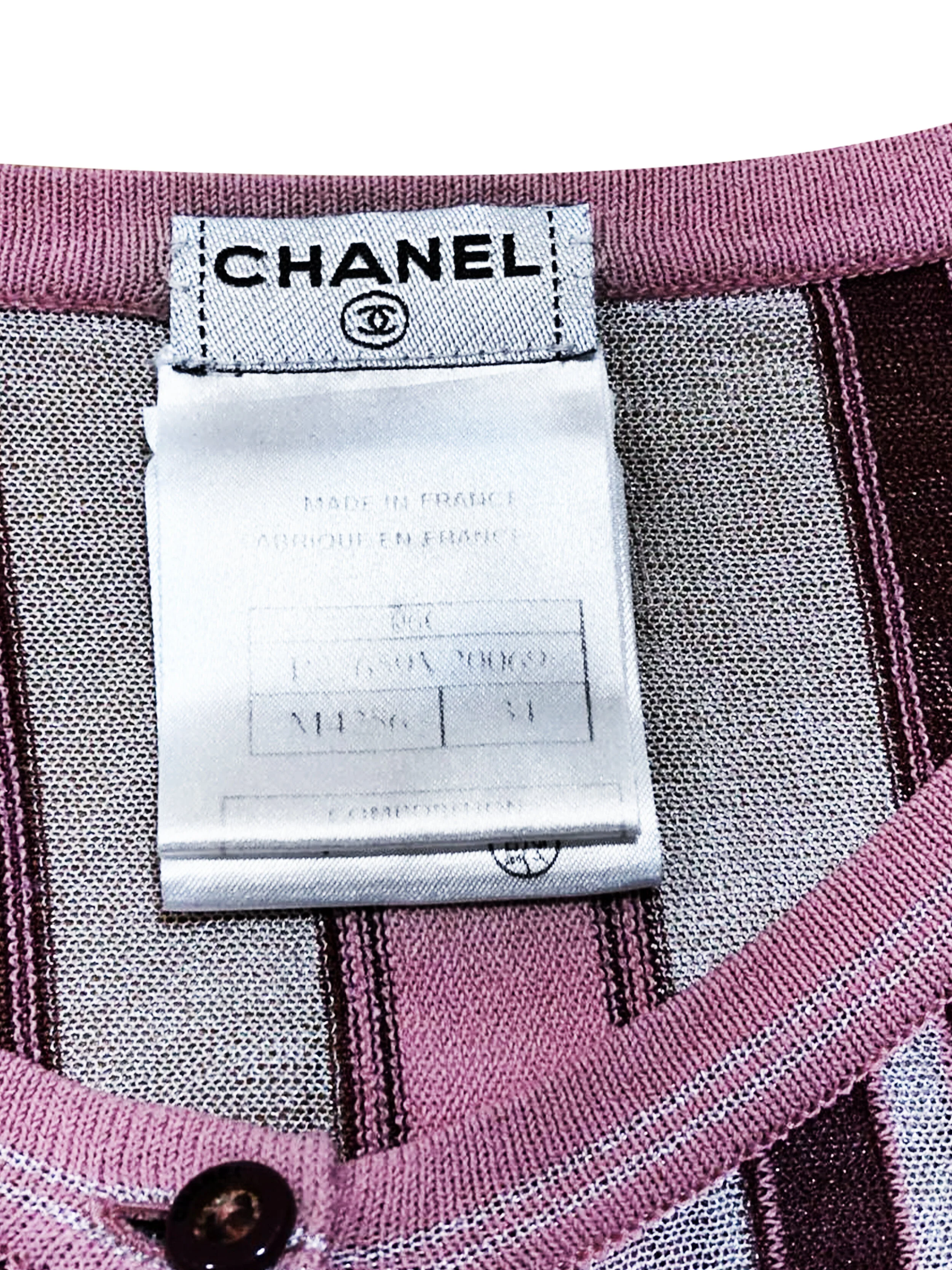 From an early 2000s Chanel collection, this set has a pink, black, and white stripe pattern throughout. It comes with a tank and cardigan. The cardigan opens with a black button opening. It features two exterior pockets at the front.