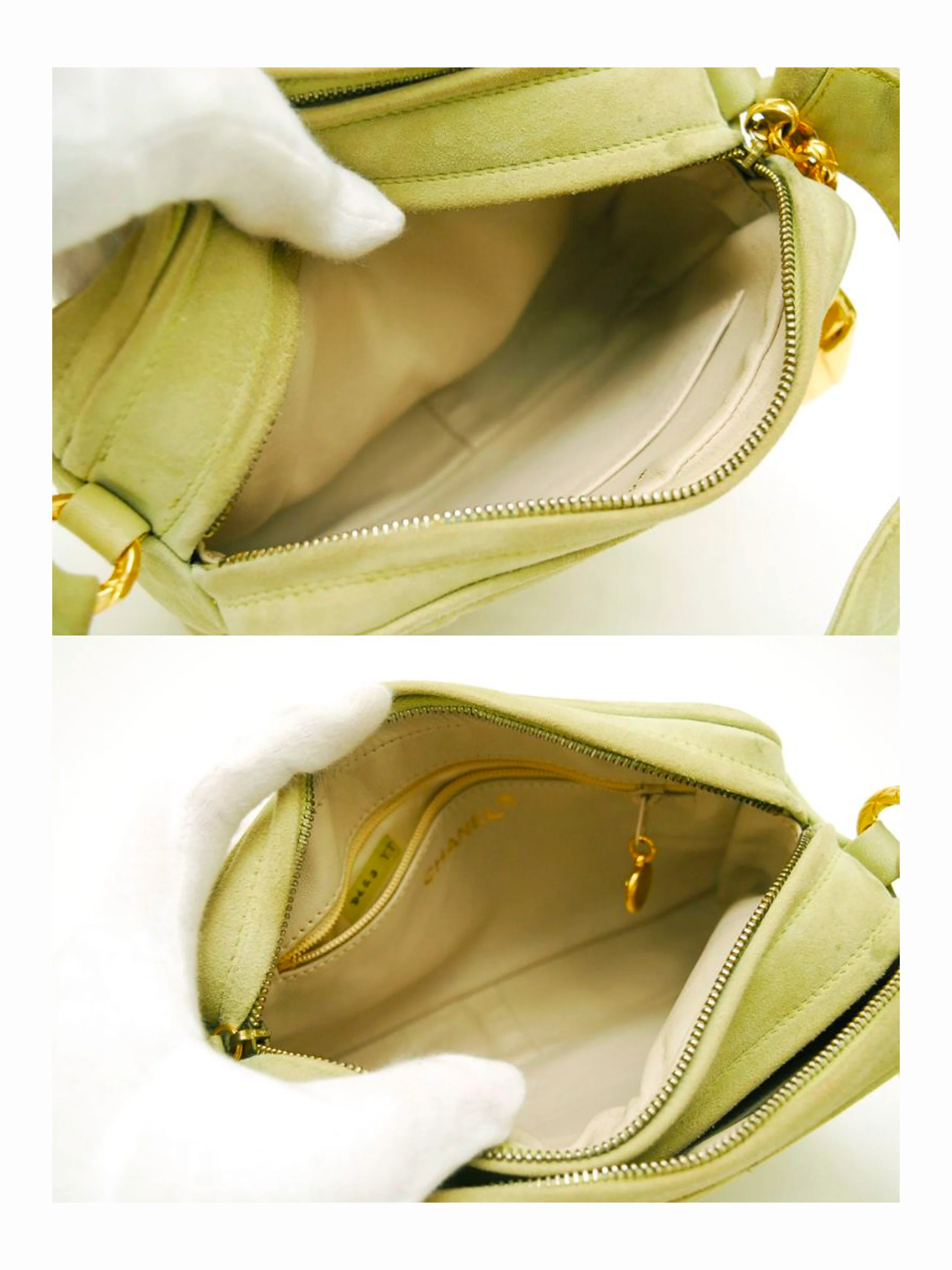 From an early Chanel collection, this suede green bag features gold charms on its side. There is a suede strap attached to both ends of the bag. Rare and hard to find. Slight signs of wear along the edges, but can be professionally cleaned.