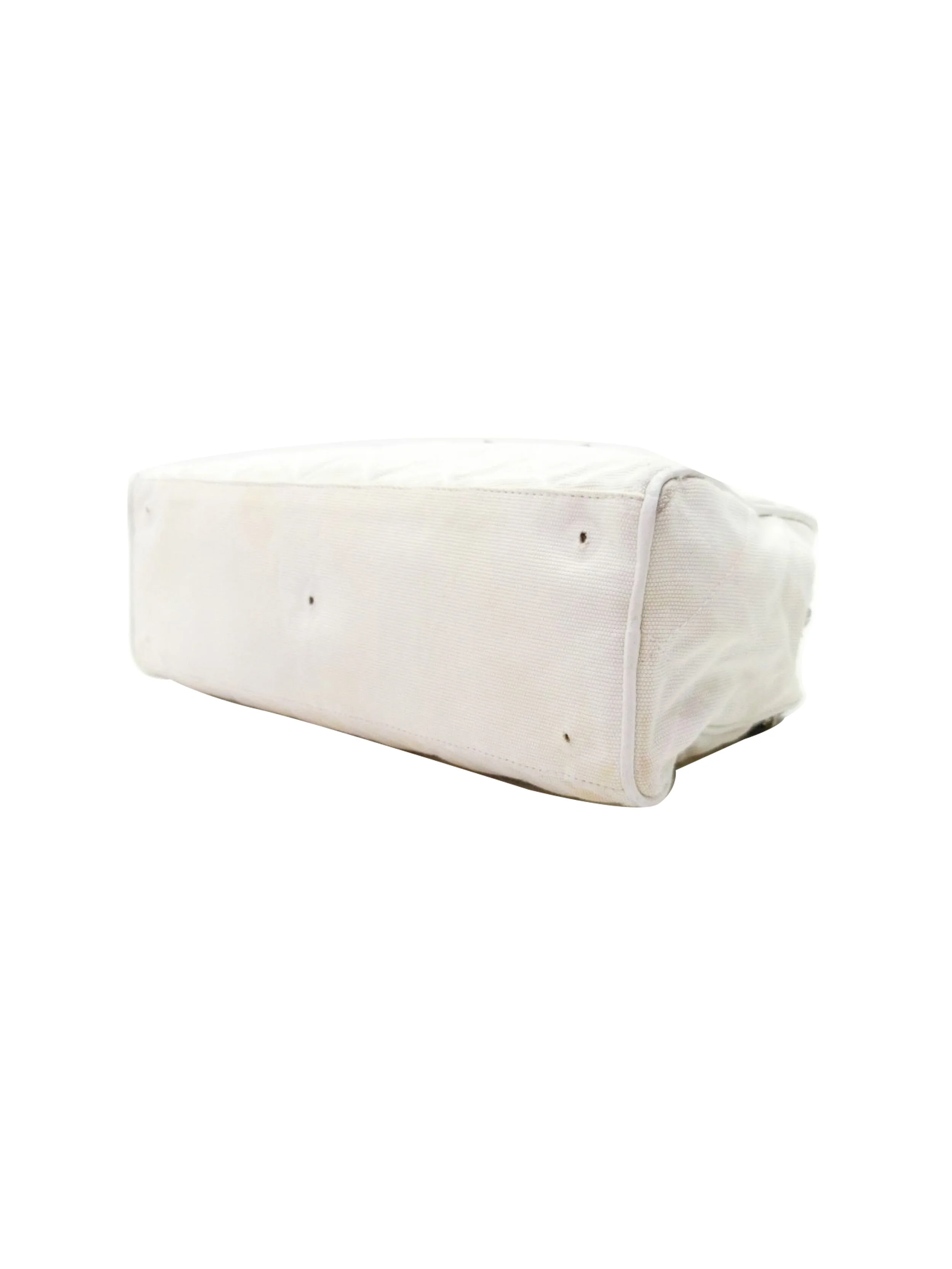 From an early Chanel collection, this incredible tote features the signature Chanel logo in gray patches sewn onto the front. Composed of genuine white quilted canvas and lined with a white leather interior. It has silver hardware throughout and opens with zipper. Rare and hard to come by. Has some staining and missing gimlets hardware on the bottom.
