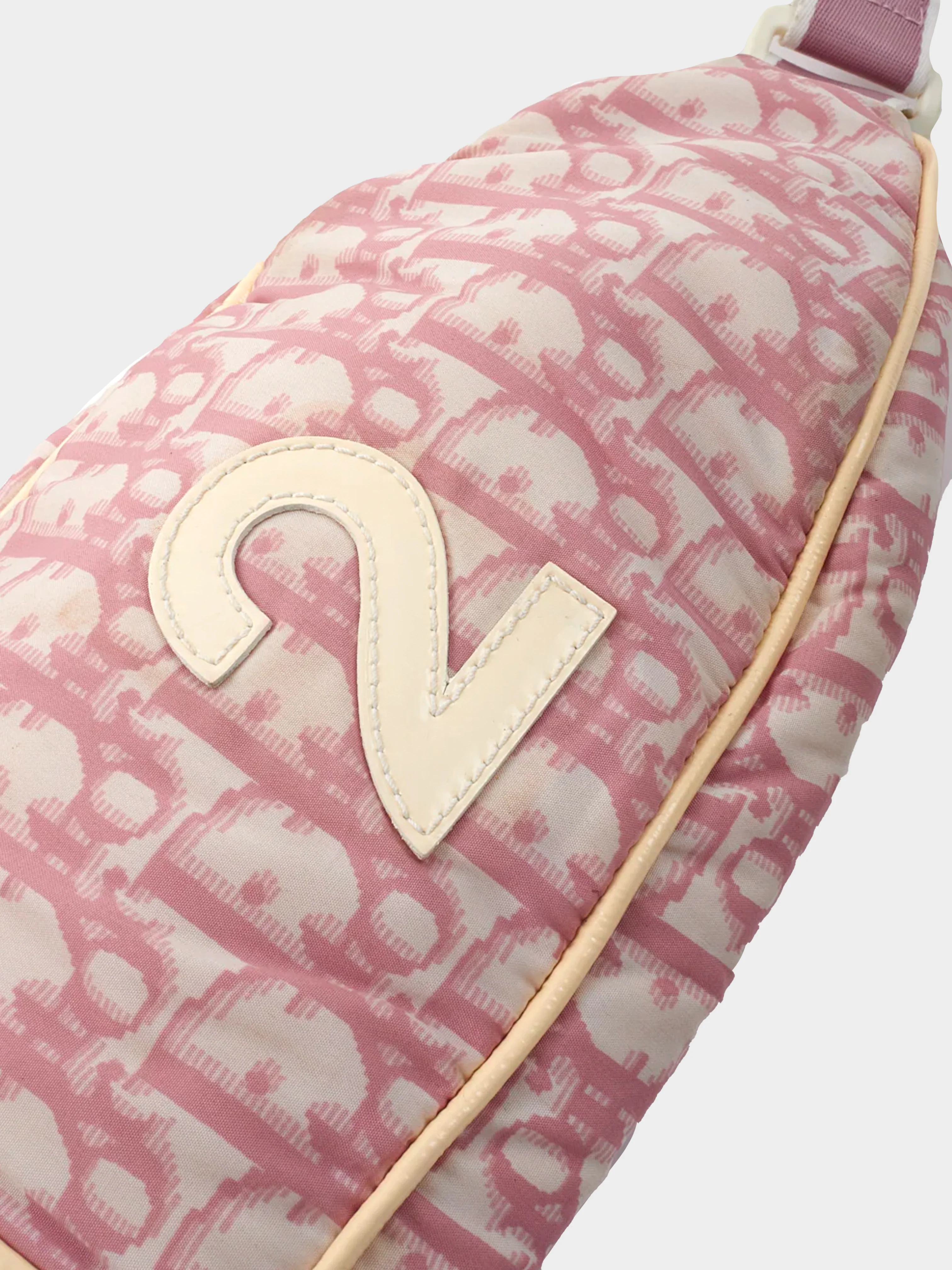 From a 2004 Christian Dior collection, this bag is crafted out of pink Diorissimo monogram nylon. It features a fanny pack strap, top zipper closure and a back pocket.Â