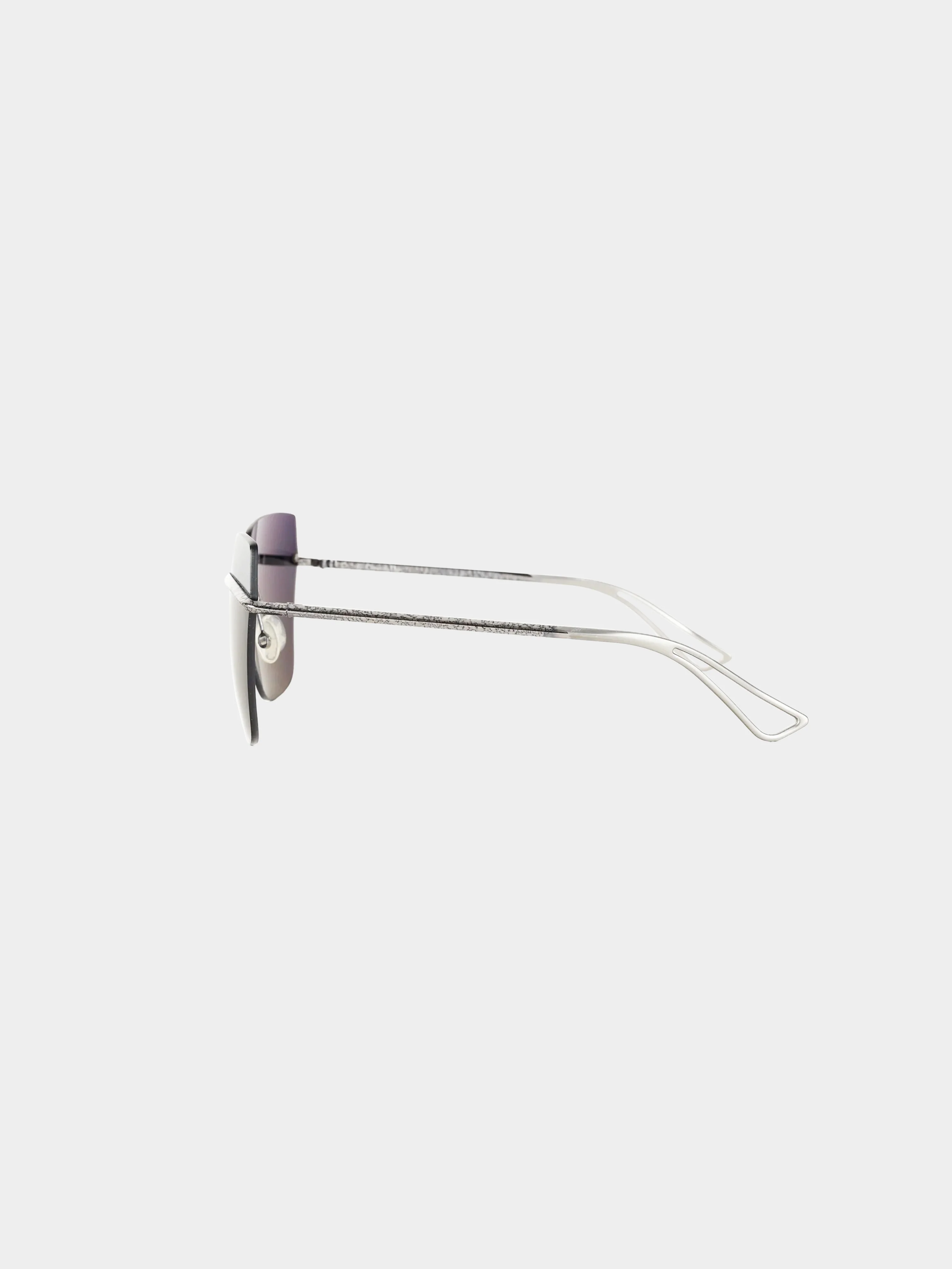 From the 2015 Christian Dior Metallic collection, this pair of sunglasses is designed with a metal frame in a mottled finish. It features a mirror panel on top of the lenses. It has adjustable nose pads and thin temples.