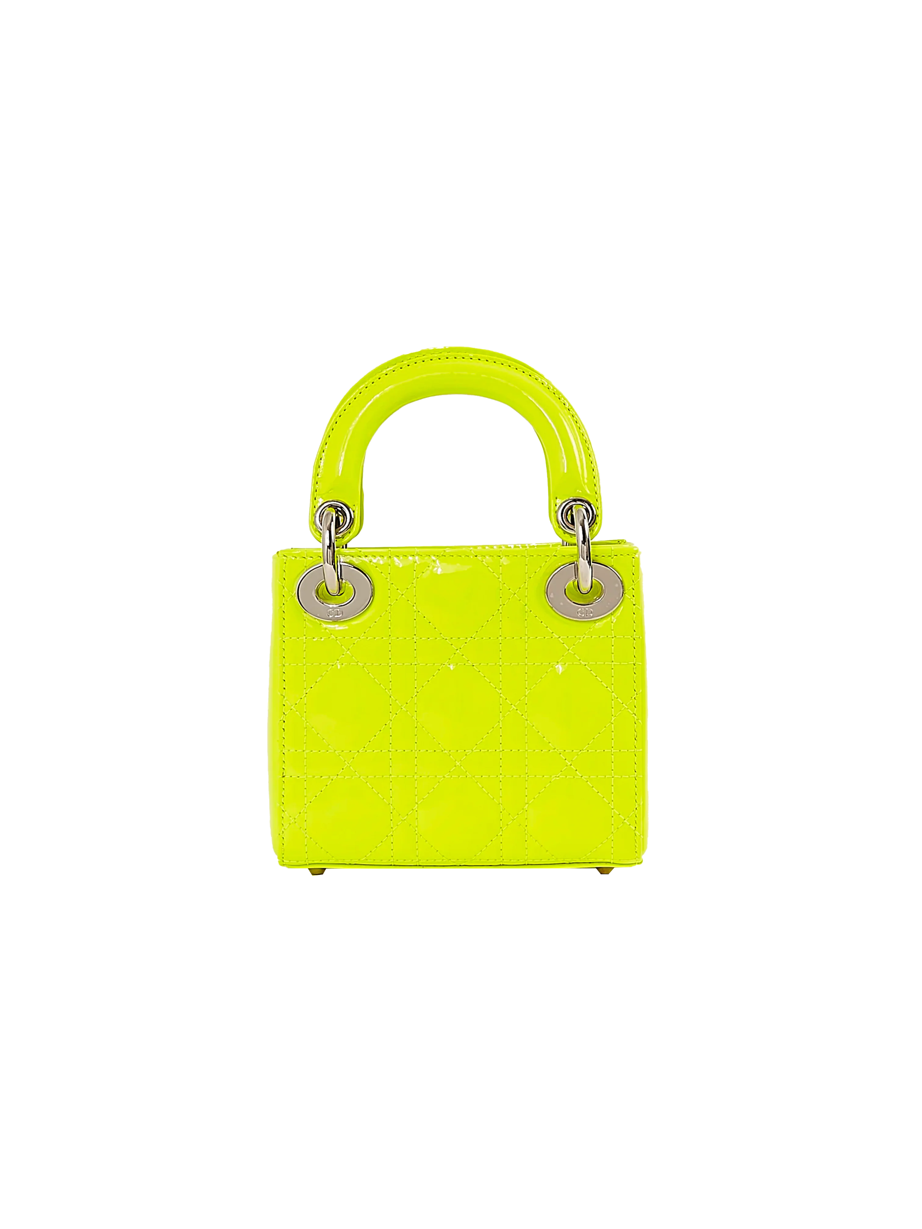 From a 2016 Christian Dior collection, this bag is crafted out of quilted neon yellow patent leather. It features a pink patchwork detail, a DIOR charm, and an adjustable crossbody strap.