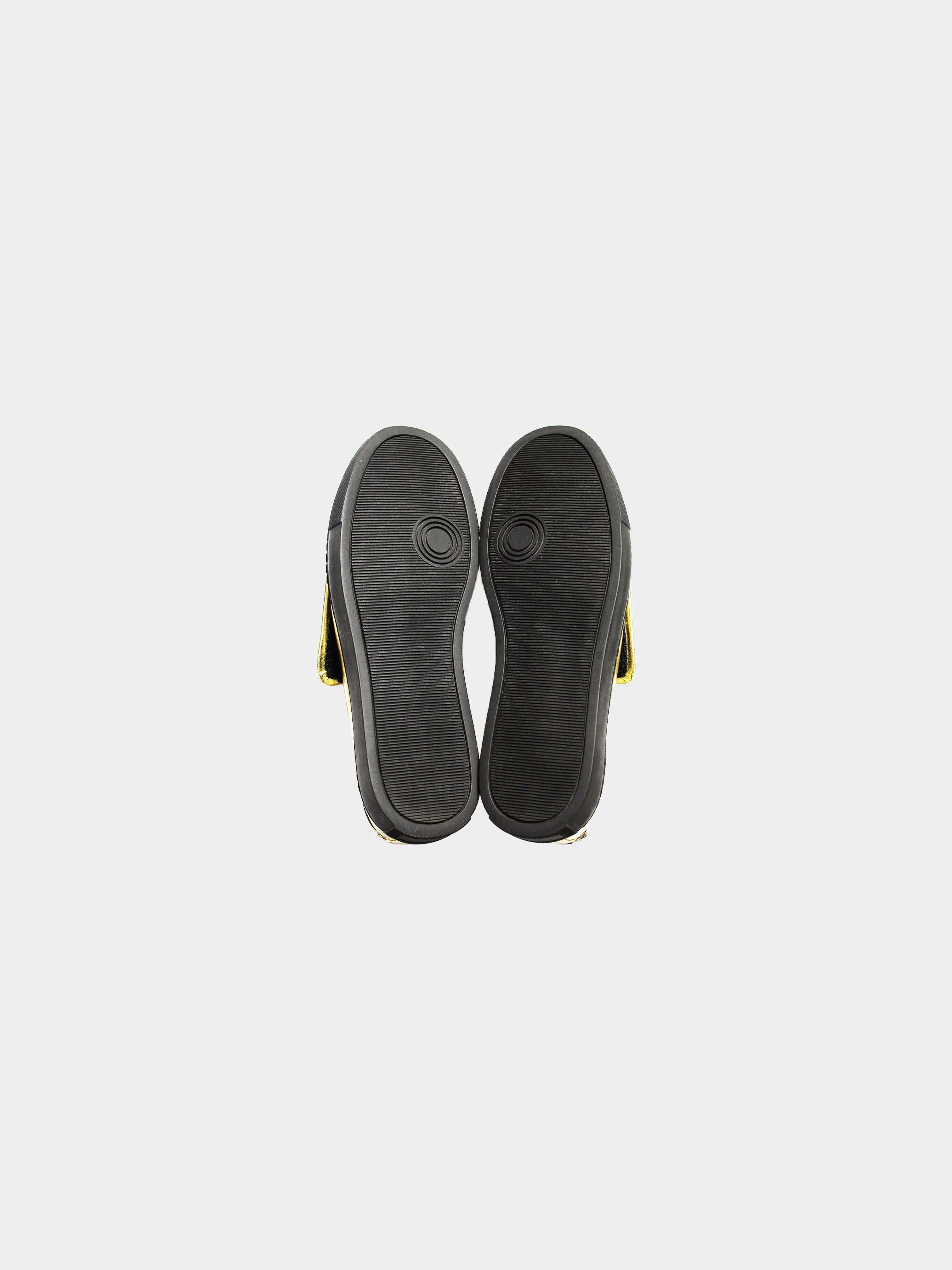 From a Spring Summer 2007 Comme des Garçons collection, this pair of loafers features a metallic faux-leather upper in gold and a black tread. It has Velcro panel at the vamp and D-ring hardware at the heel collar.