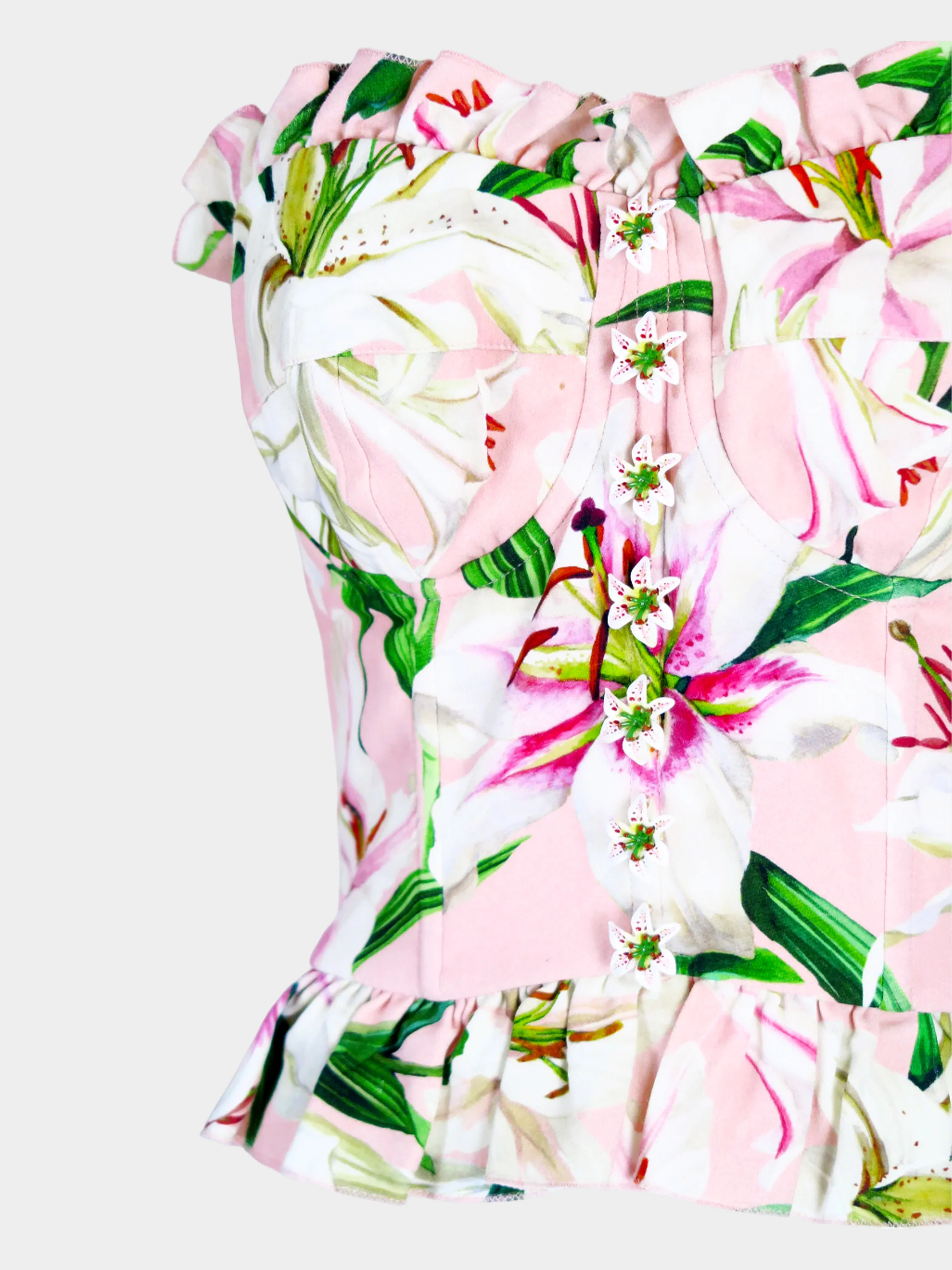 From the 2019 Dolce and Gabbana collection, this top is designed in Viscose blend fabric. It features a tube and bustier style with lily prints on a pink base. The top has ruffle details and lily flower buttons in the middle.