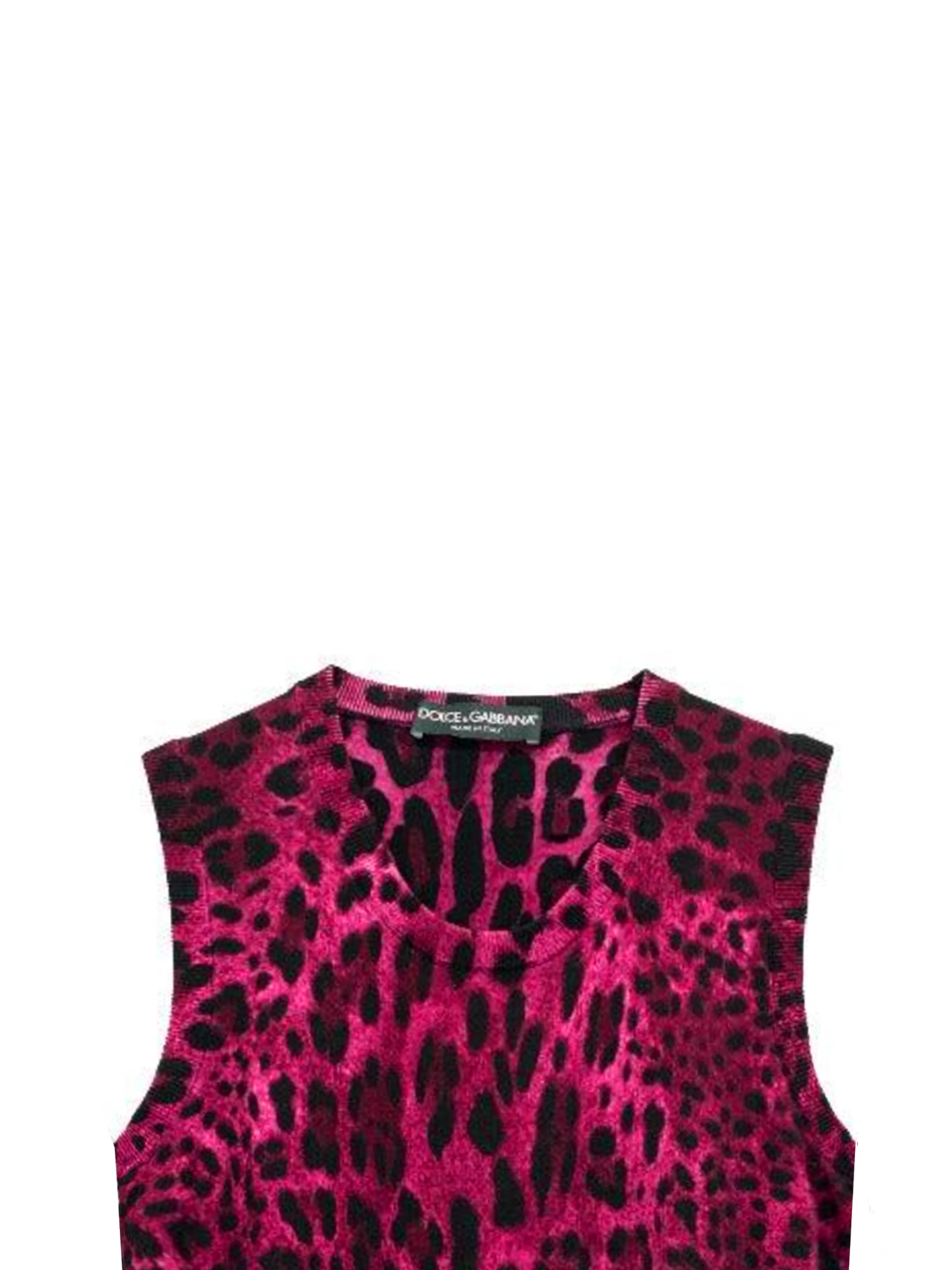 From an early 2000s Dolce and Gabbana collection, this sweater is crafted out of a knit wool material. The sweater has a pink leopard print and is sleeveless.