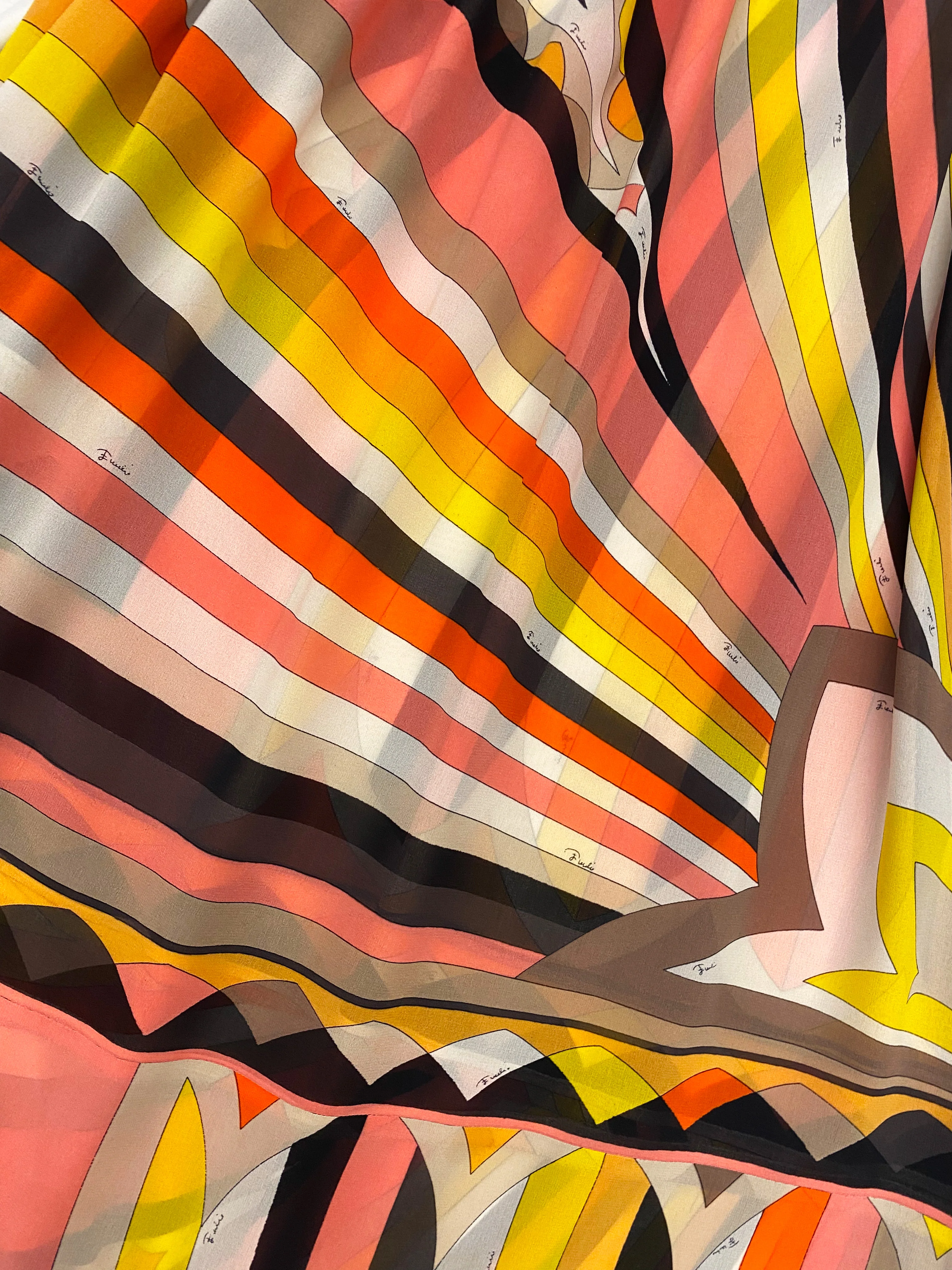 From a 1970s Emilio Pucci collection, this dress is made from a silk chiffon fabric. It features a sunset pattern in a pink, yellow, black and orange array that highlights its empire waist silhouette. This dress is 3/4 in length.Â