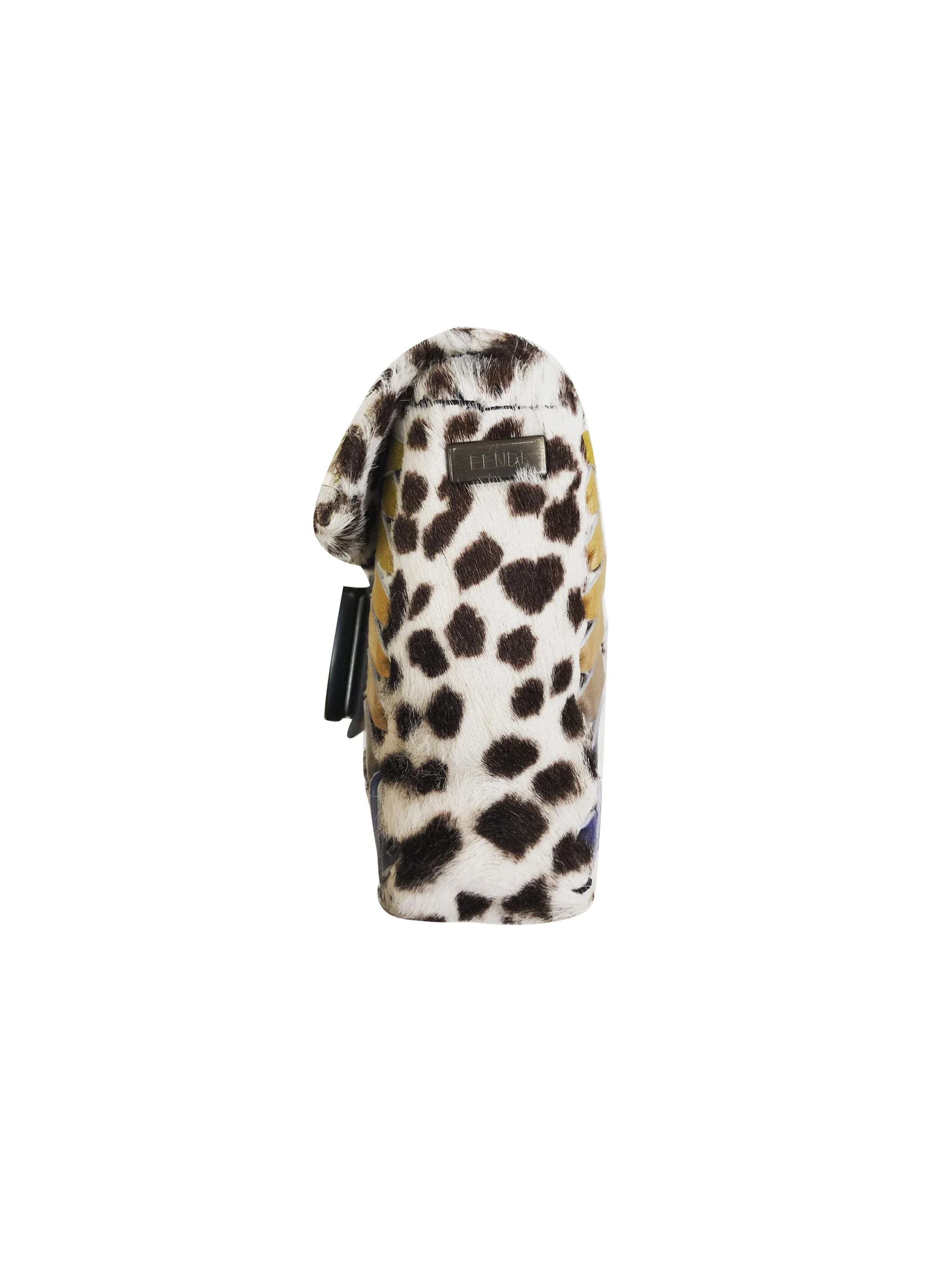 From an early 2000s Fendi collection, this incredible limited edition bag features the signature Fendi logo on the front. Composed of genuine rainbow whipstitch and cheetah faux fur print. It has silver hardware throughout and opens with a button clasp. Rare and hard to come by.