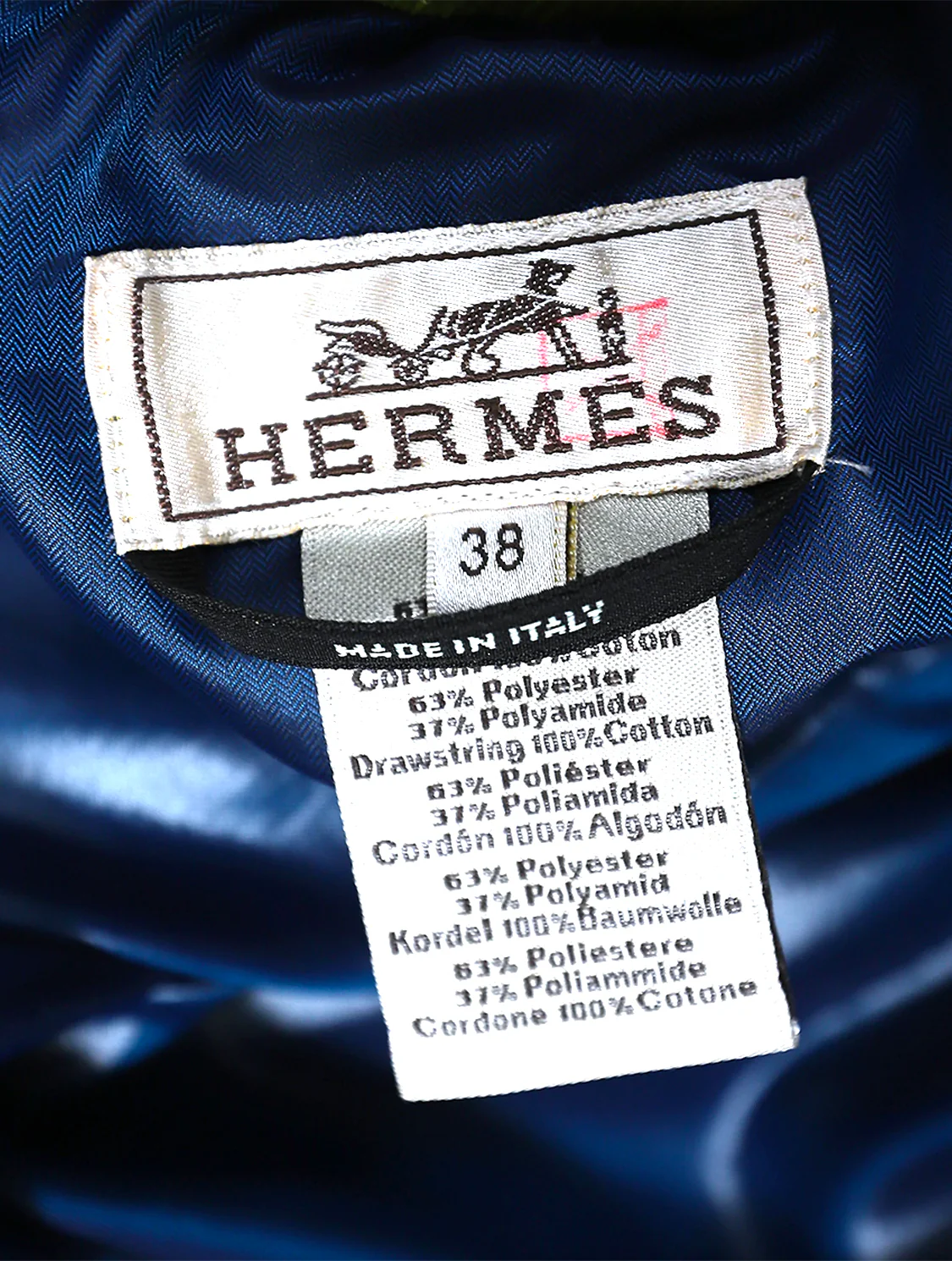 From the 1998 Hermès collection, these pants feature shiny blue nylon throughout with neon green details along the sides and an elastic waistband. It has a black drawstring at the front.