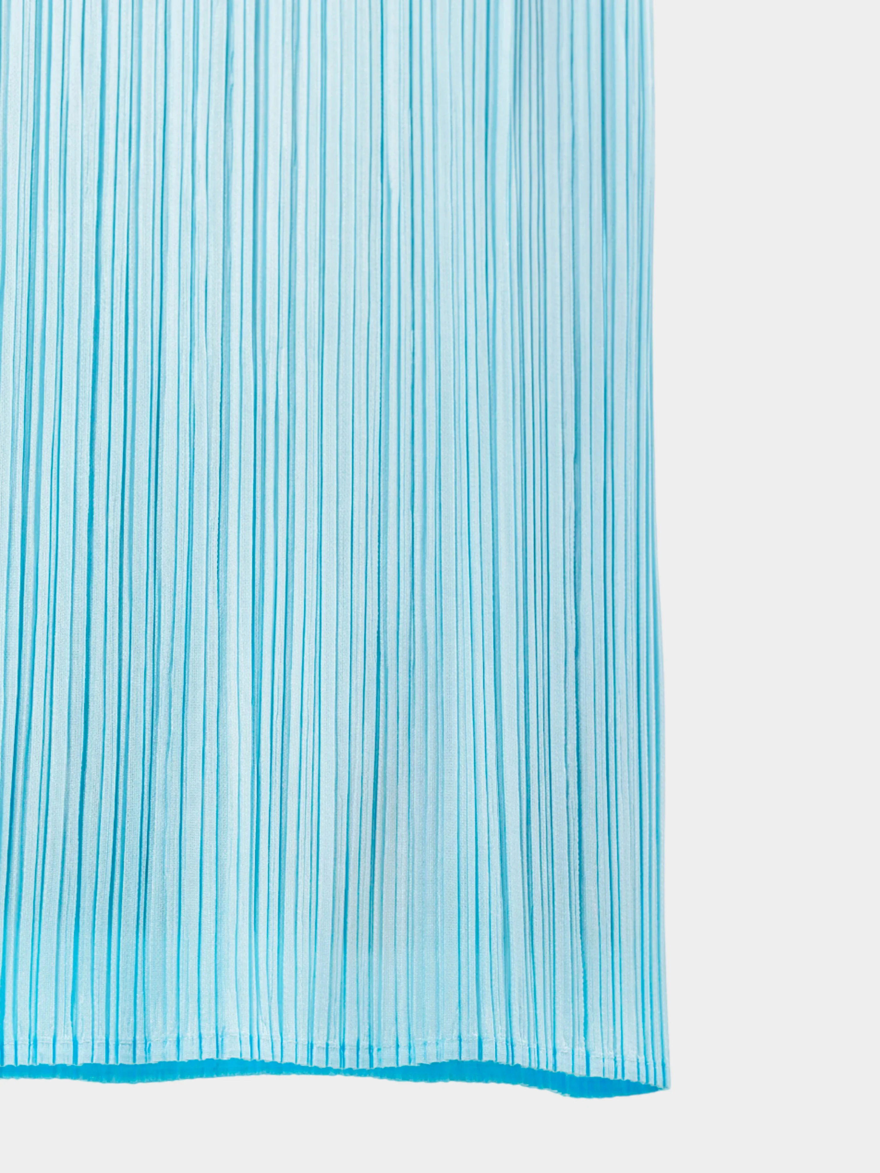 From the 2000s Issey Miyake collection, this skirt is crafted from pure polyester fabric in a light blue hue. It features a straight cut with signature pleating throughout and has an elastic waist. This skirt has been altered. The label tag has been removed to accommodate a nude tone lining and the original 18-inch side slit has been closed leaving a 2-inch slit.