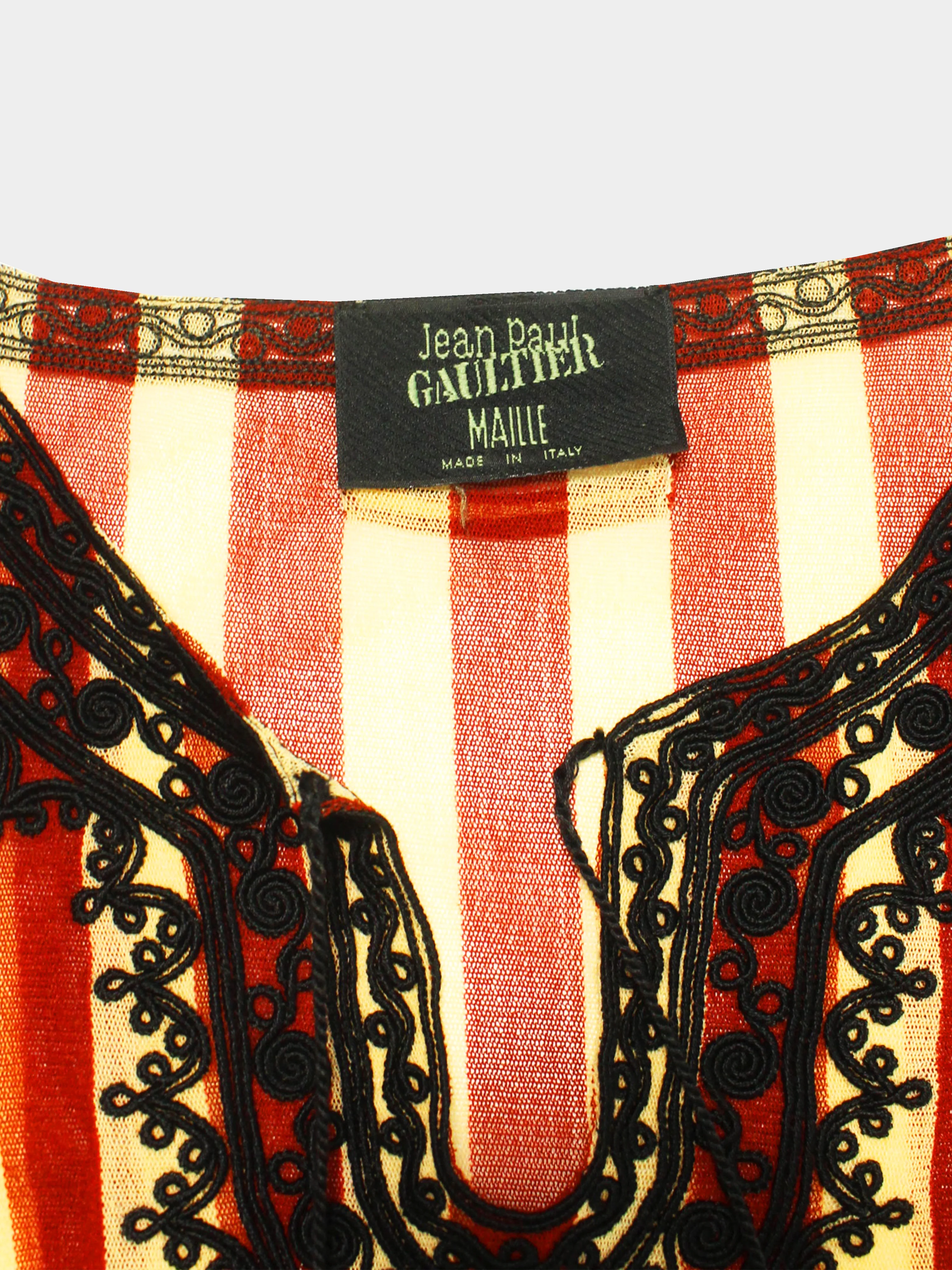 From a 1990s Jean Paul Gaultier collection, this tunic features a beige and red striped mesh body. It features black lace trim throughout, a fitted silhouette and a tie closure in the front.