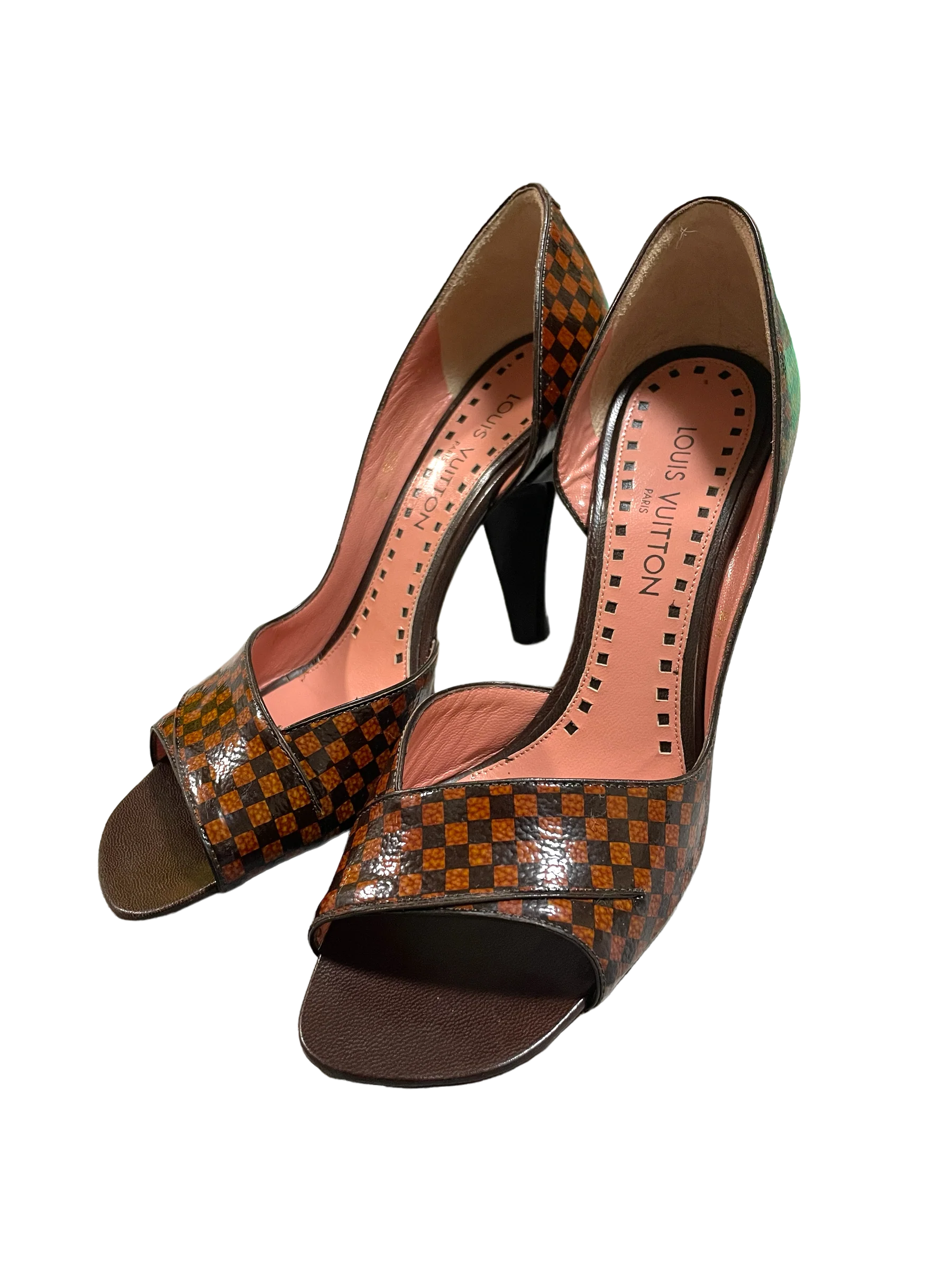From the 2000s Louis Vuitton collection, these open-toe pumps are made from checkered printed leather. They open on the side of the foot and have a curved leather heel.Â