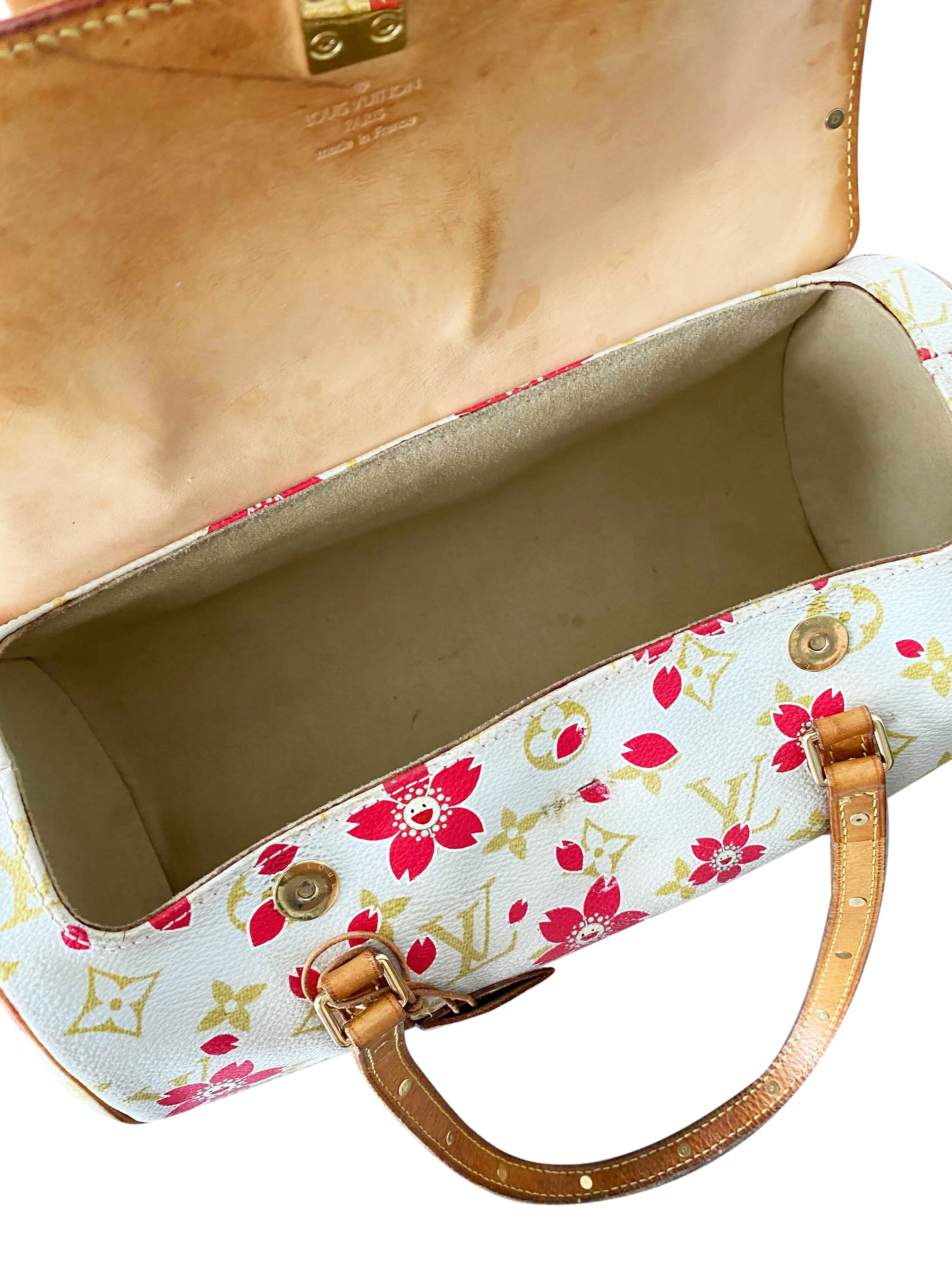 From a 2000s Louis Vuitton x Takashi Murakami Collection, this limited edition cherry blossom papillon has a snap closure and round silhouette. It features two leather straps and trimming highlighting gold studs and an LV lock in a bow.