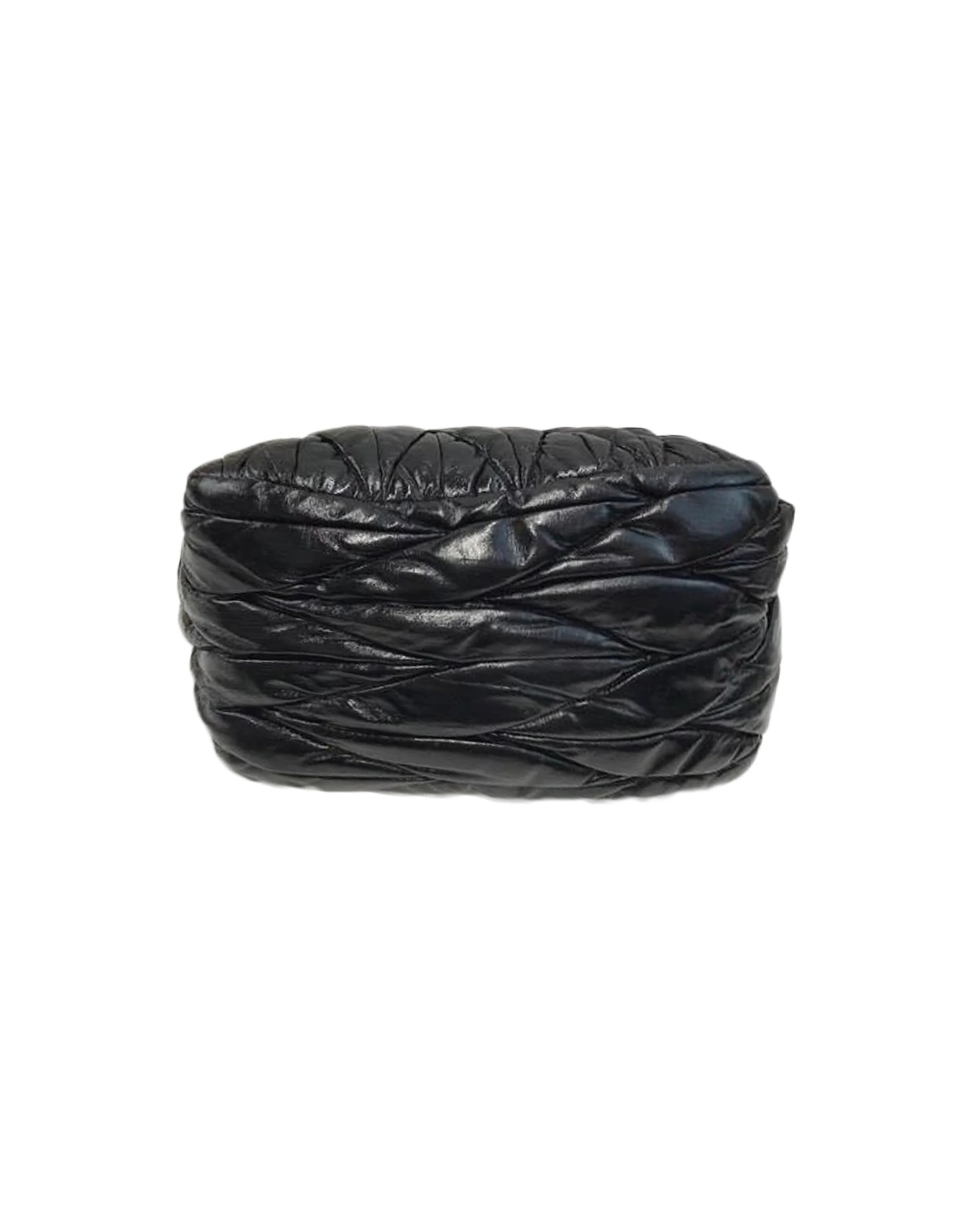 From an early Miu Miu collection, this small tote is composed of genuine black matelassé leather with a nylon interior. It has tonal threading to complete the texture and features the logo in gold.
