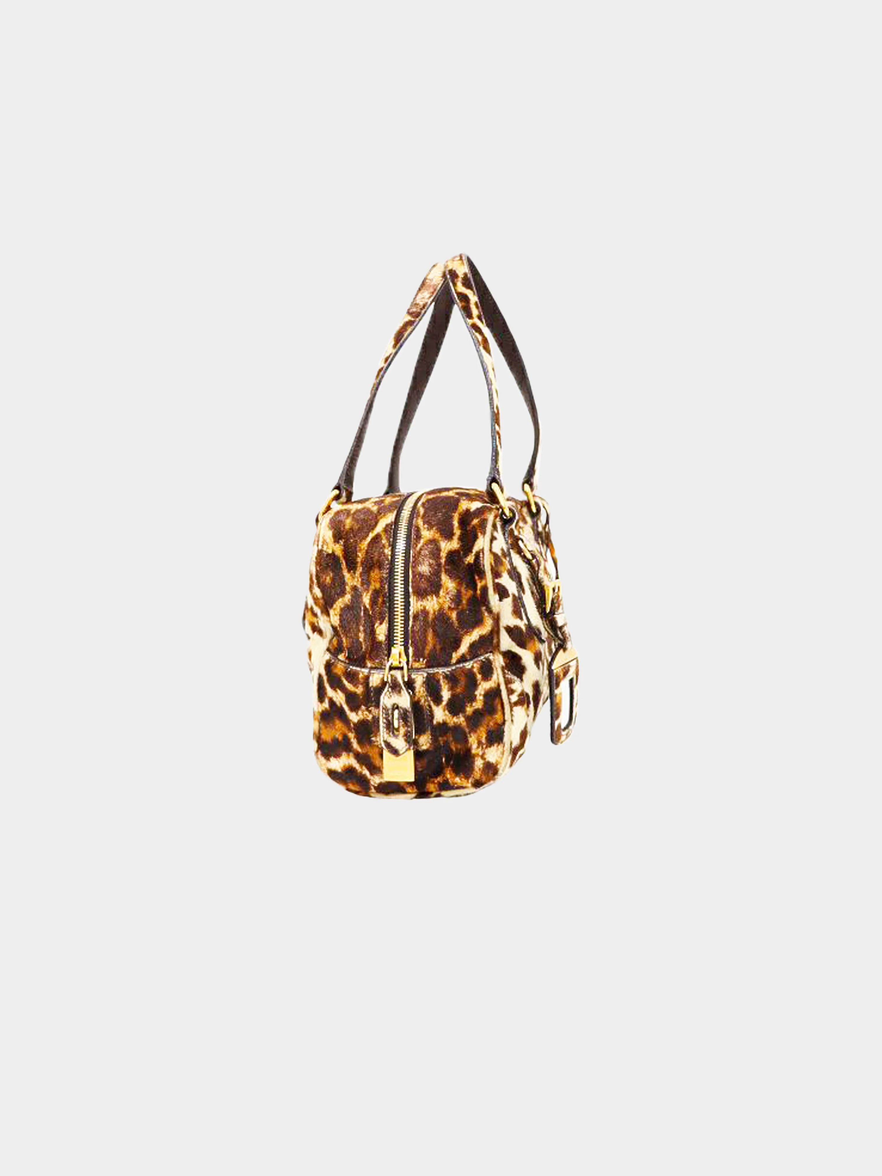 From the 2010s Prada collection, this bag is crafted out of calf hair in a leopard pattern. It features a signature gold-tone enameled triangle logo at the front and a matching luggage tag. It has a clochette and a gold-tone lock hardware.