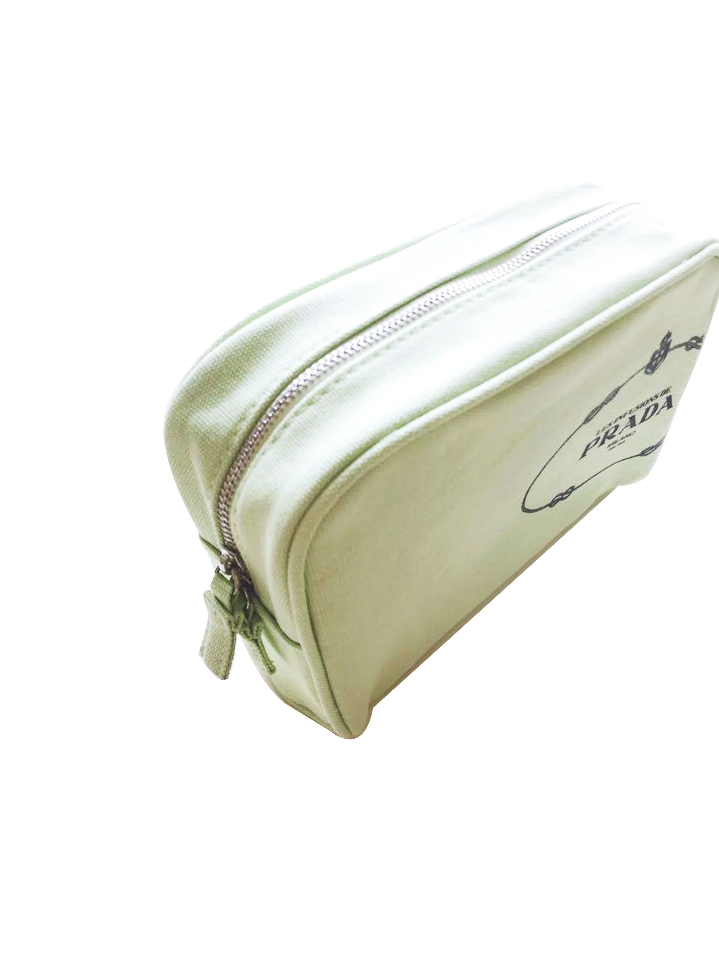 From an early 2000s Prada Infusions collection, this incredible makeup bag features the signature Prada logo graphic on the front. Composed of genuine green knit and lined with green nylon interior. It has green hardware throughout and opens with a zipper. Rare and hard to come by.
