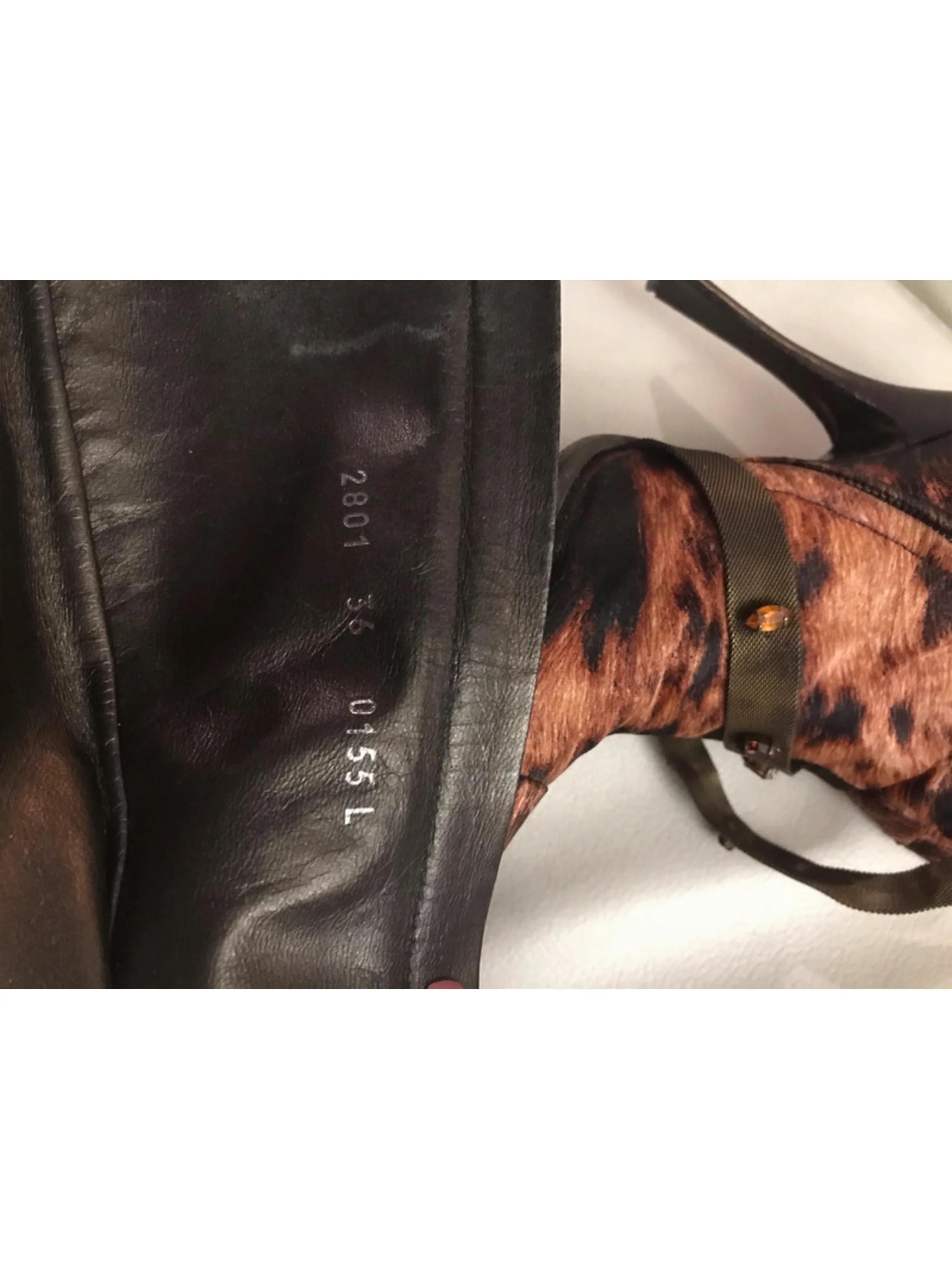 From the 2000s Roberto Cavalli collection, these boots feature a leopard print upper. The shaft of the boots is constructed in black leather. There are green leather straps that go across the upper with gold studs.